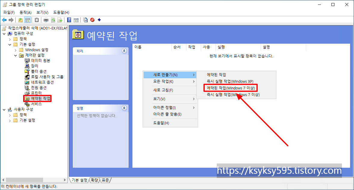 [컴퓨터 구성] --> [기본 설정] --> [제어판 설정] --> [예약된 작업] 으로 이동 후, 우 클릭 하여, [새로 만들기] --> [예약된 작업(Windows 7 이상)] 을 클릭합니다.