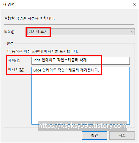 동작을 [메시지 표시] 로 설정 후, 사용자에게 보낼 [제목] 과 [메시지] 를 입력 후, 생성합니다.