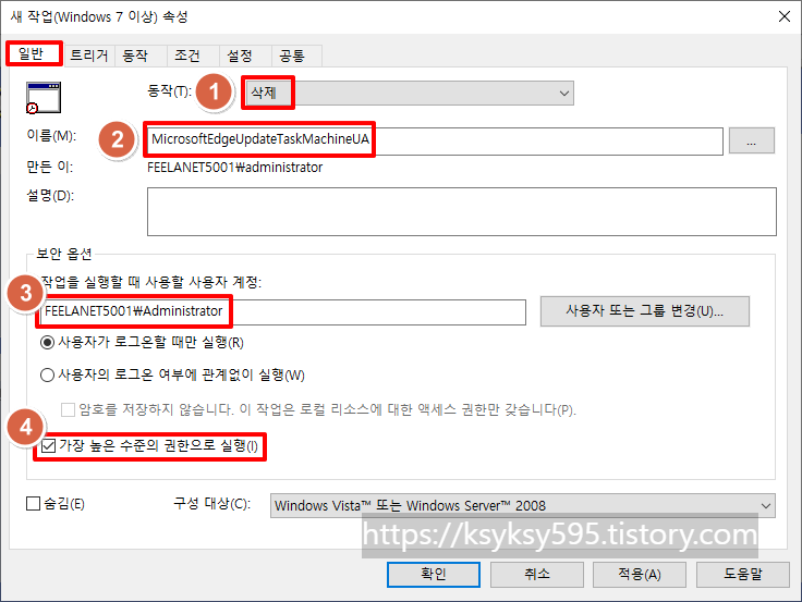 ④ 가장 높은 수준의 권한으로 실행 : [체크]