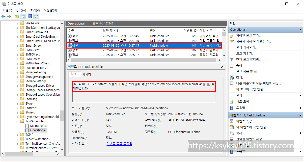 이벤트 뷰어 에서도 작업 스케줄러가 삭제되었다는 Log 를 확인할 수 있습니다.
