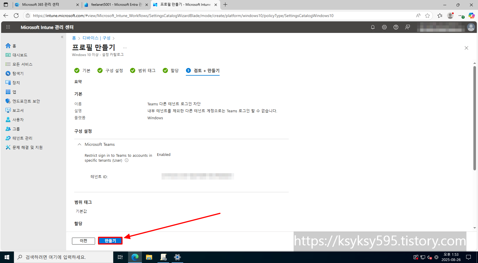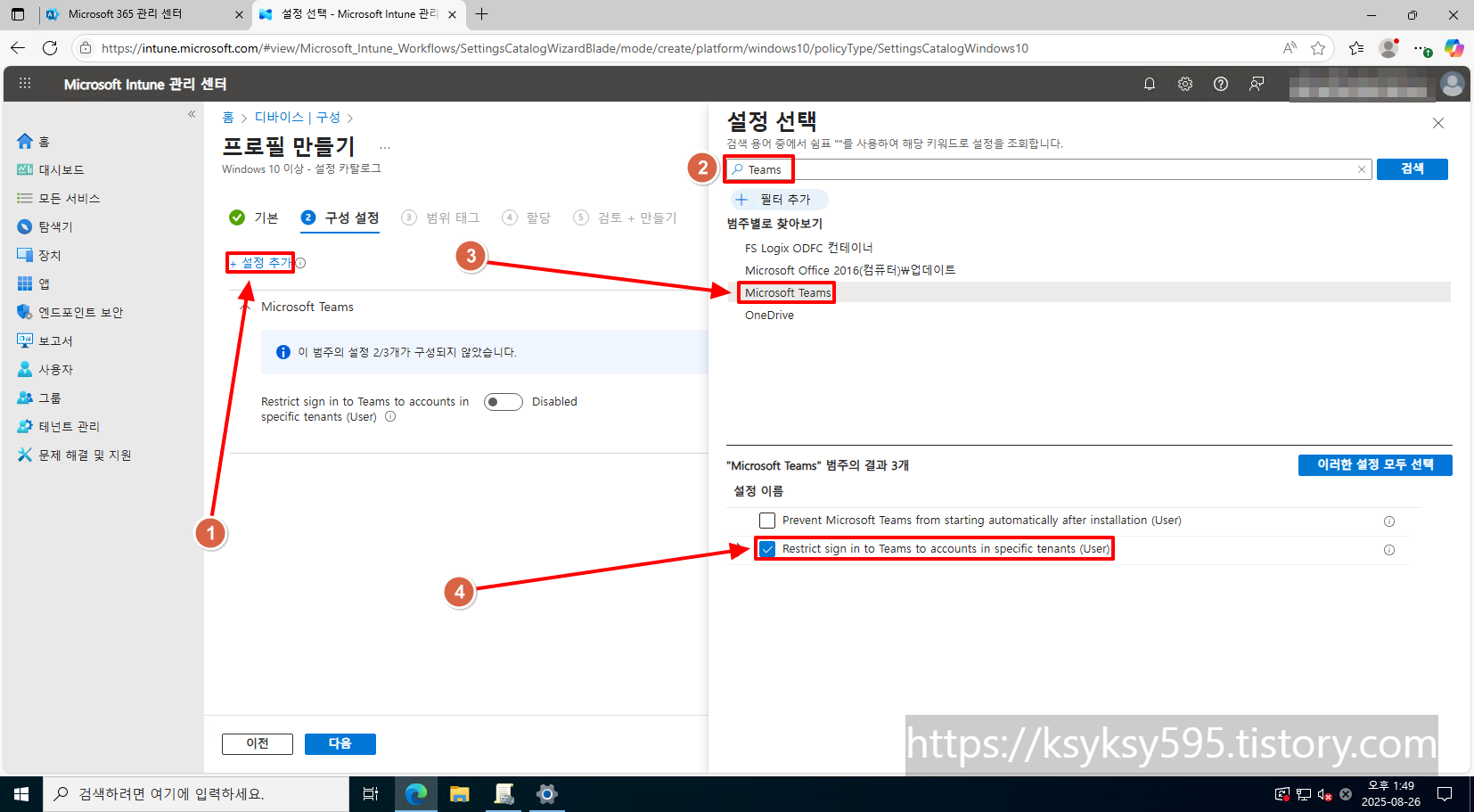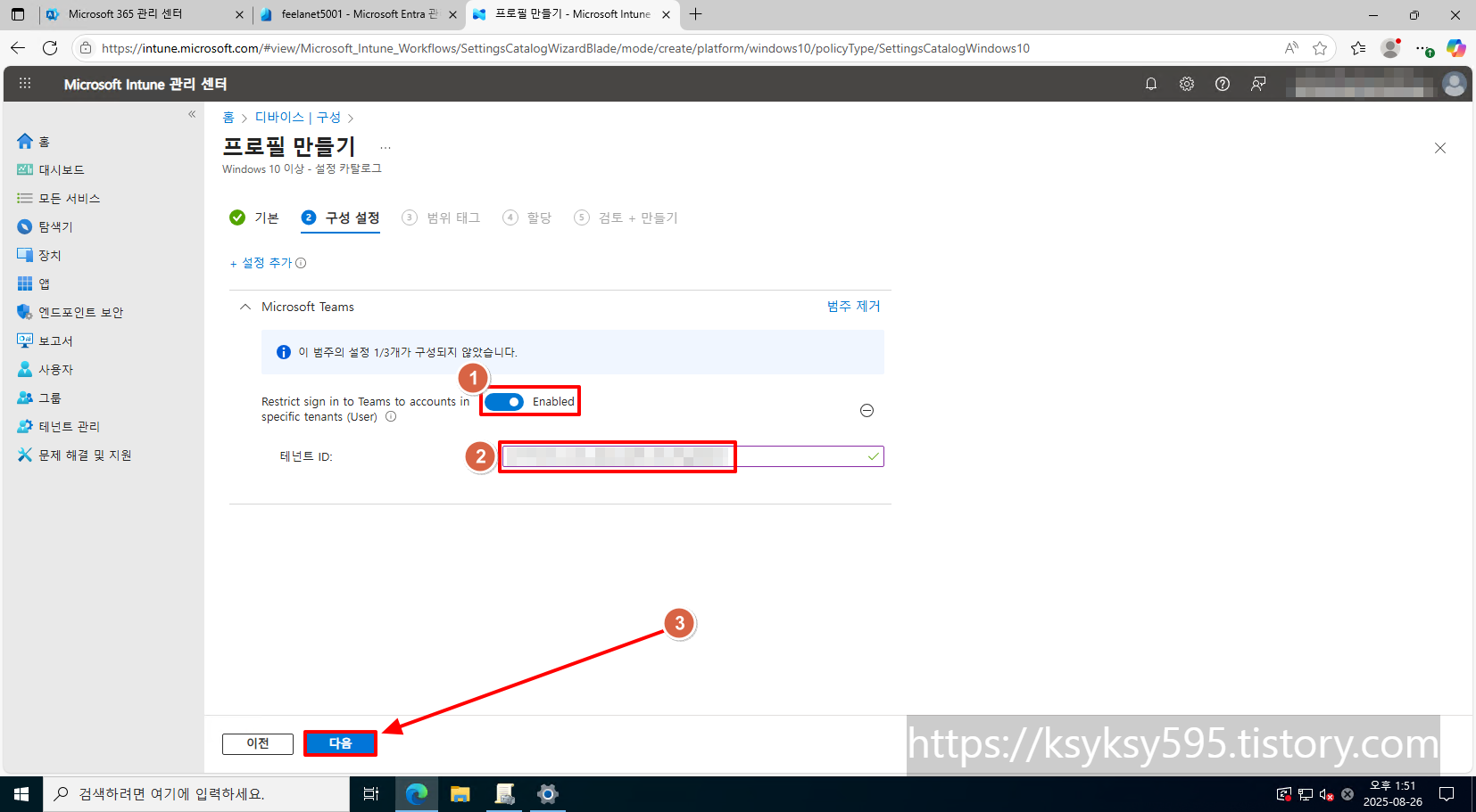 [Restrict sign in to Teams to accounts in specific tenants (User)] 를 [Enabled] 로 변경 후, [테넌트 ID] 를 입력 후, [다음] 을 클릭합니다.