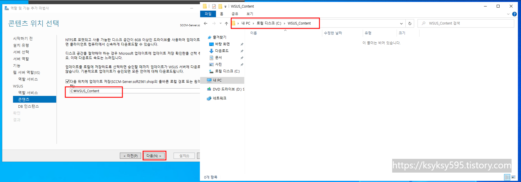 [WSUS 콘텐츠] 에서 MECM 서버의 WSUS_Content 폴더를 생성 후, 해당 위치로 지정합니다.