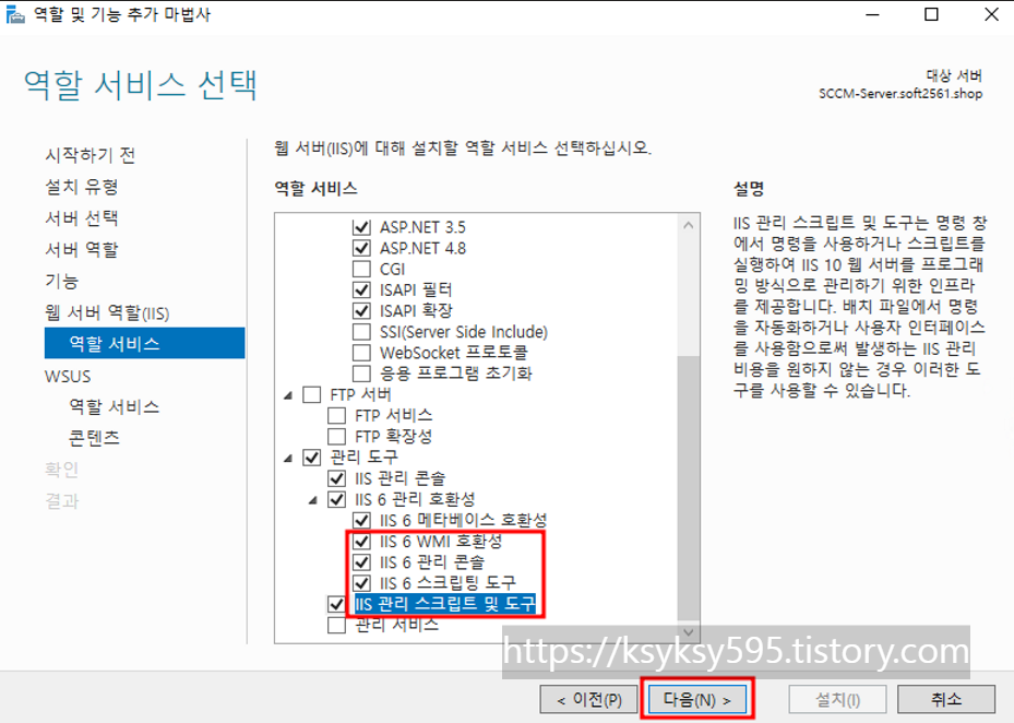 [웹 서버 역할(IIS)] 에서 [.NET 확장성 3.5] & [ASP.NET 3.5] & [IIS 6 WMI 호환성] & [IIS 6 관리 콘솔] & [IIS 6 스크립팅 도구] & [IIS 관리 스크립트 및 도구]를 선택 후, [다음]을 클릭합니다.