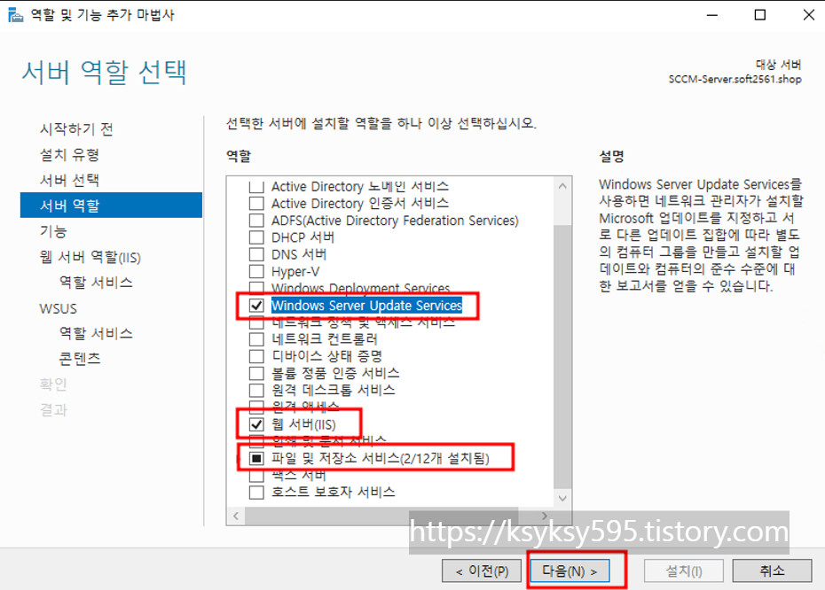 [서버 역할] 에서 [Windows Server Update Services] & [웹 서버 (IIS)] & [파일 및 저장소 서비스]를 선택 후, [다음]을 클릭합니다.