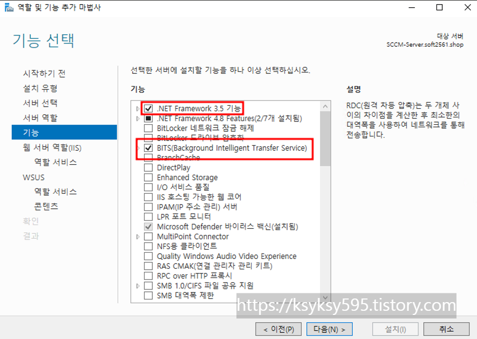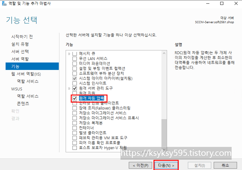 [기능]에서 [. Net Framework 3.5 기능] & [BITS] & [원격 차등 압축]을 선택 후, [다음]을 클릭합니다.