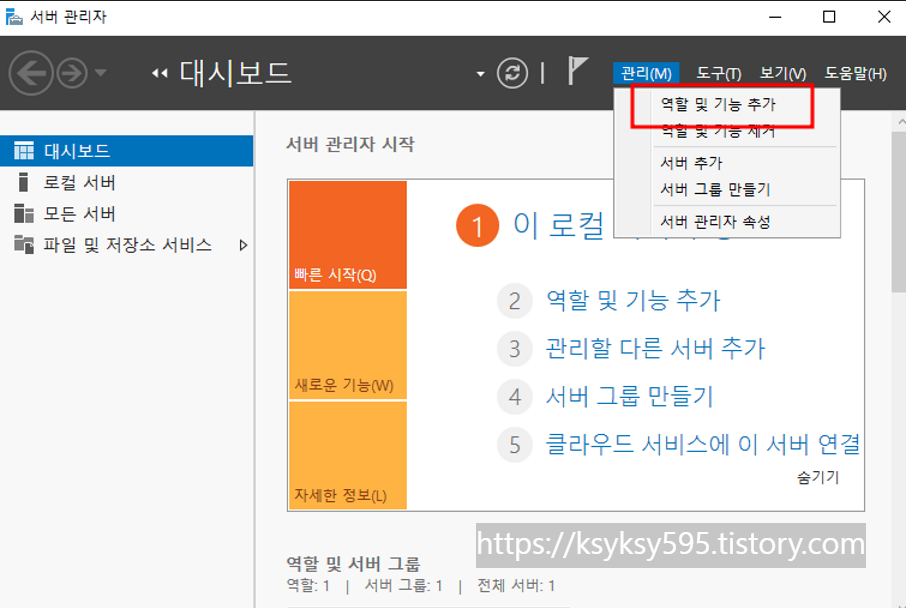 MECM 서버에서 서버 관리자 --> 도구 --> 역할 및 기능 추가를 클릭합니다.
