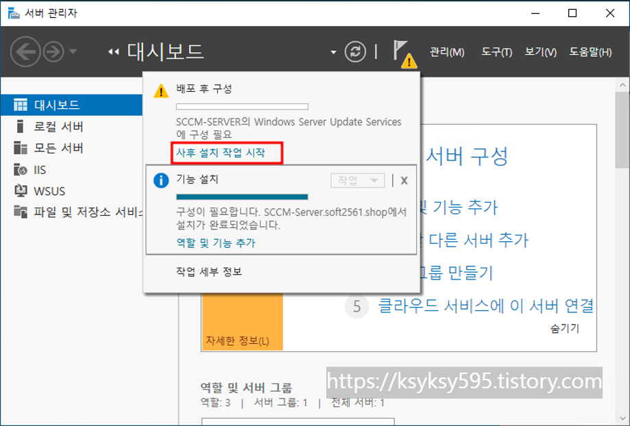 경고 표시가 확인되는 깃발을 클릭하여, WSUS [사후 설치 작업 시작]을 클릭하여, 사후 설치 작업을 진행합니다.