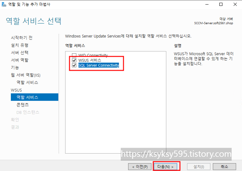 [WSUS 역할 서비스] 에서 [WSUS 서비스] & [SQL Server Connectivity]를 선택 후, [다음]을 클릭합니다.