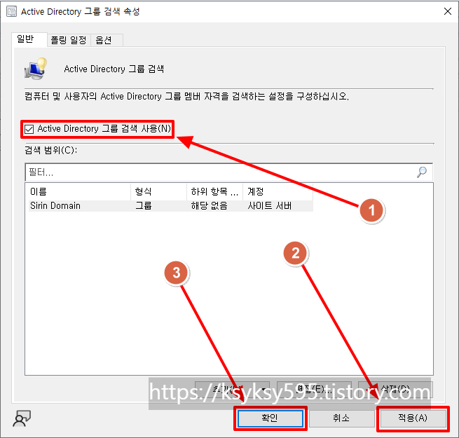 [Active Directory 그룹 검색 사용]을 체크 후, [적용] --> [확인]을 클릭합니다.