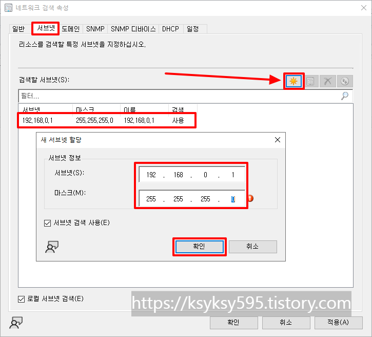 [서브넷] 탭에서 태양(?) 문양을 클릭 후, [서브넷] & [마스크] 입력 후, [확인]을 클릭합니다.