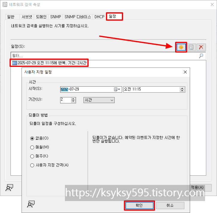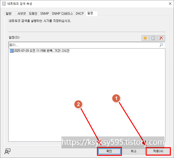 모두 체크 후, 실행 간격을 지정 후, [적용] --> [확인]을 클릭합니다.