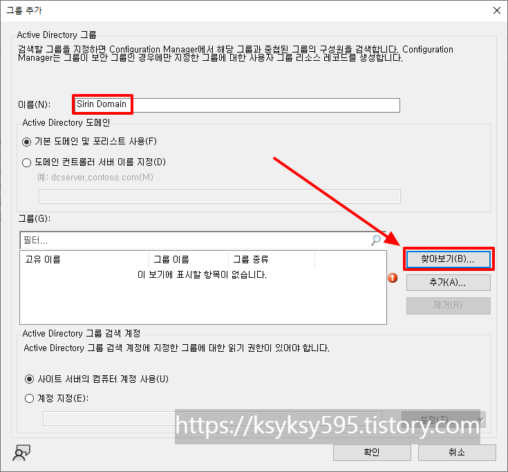 [Active Directory 그룹 검색]을 우 클릭 후, [속성]을 클릭합니다. [추가]를 선택 후, [그룹]을 클릭합니다.
