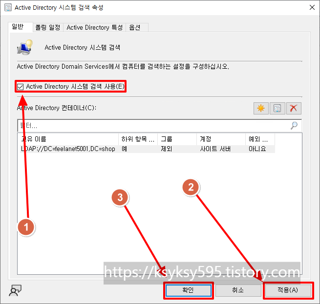 [Active Directory 시스템 검색 사용]을 체크 후, [적용] --> [확인]을 클릭합니다.